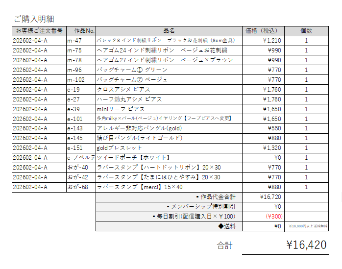 お客様ご注文番号 / 作品No. / 品名 / 価格(税込) / 個数