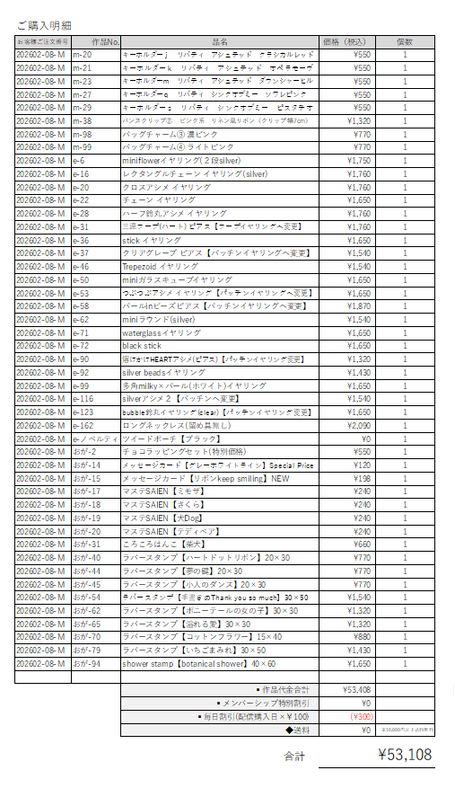 お客様ご注文番号 / 作品No. / 品名 / 価格(税込) / 個数