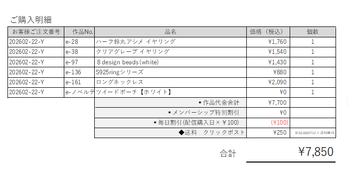 お客様ご注文番号 / 作品No. / 品名 / 価格(税込) / 個数