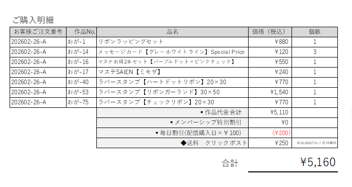 お客様ご注文番号 / 作品No. / 品名 / 価格(税込) / 個数