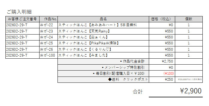お客様ご注文番号 / 作品No. / 品名 / 価格(税込) / 個数