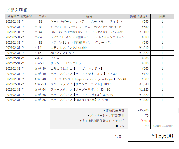 お客様ご注文番号 / 作品No. / 品名 / 価格(税込) / 個数