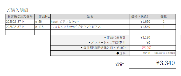 お客様ご注文番号 / 作品No. / 品名 / 価格(税込) / 個数