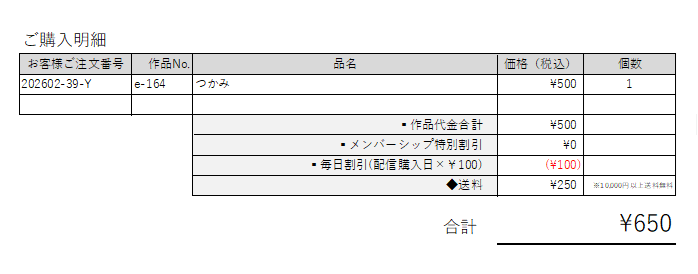 お客様ご注文番号 / 作品No. / 品名 / 価格(税込) / 個数